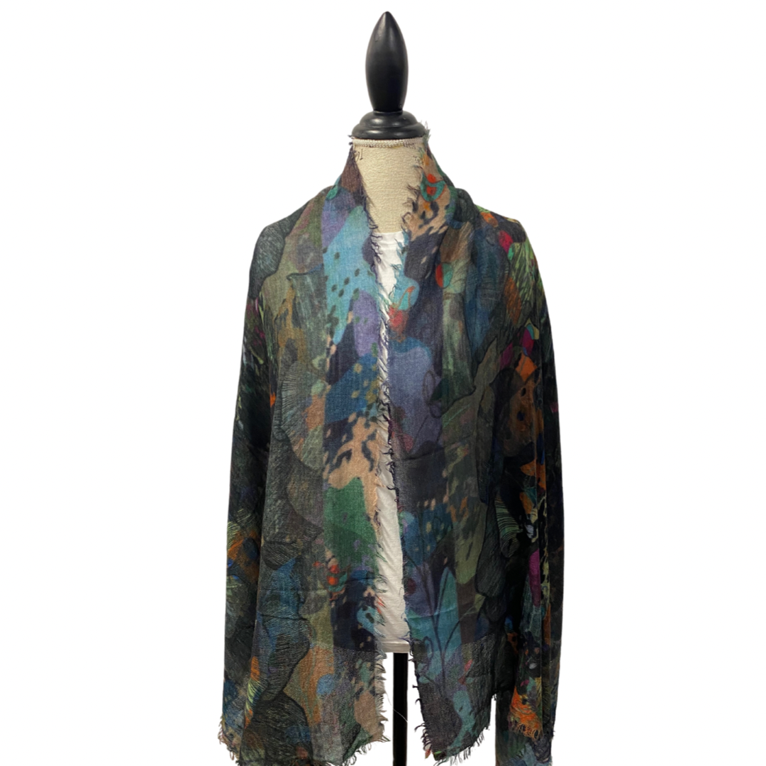 Luxurious wool and silk blend scarf with vibrant multicolor design, perfect for fall fashion. Soft, lightweight, and stylish accessory.