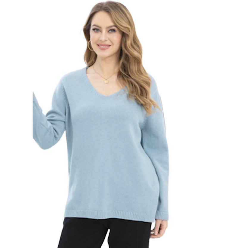 An easygoing essential with timeless appeal. This soft blue V-neck sweater is crafted from a cozy, medium-weight knit that drapes beautifully without bulk. Subtle ribbed detailing at the neckline, cuffs, hem and two slits at teach side gives it a polished finish, while the relaxed fit makes it perfect for layering.