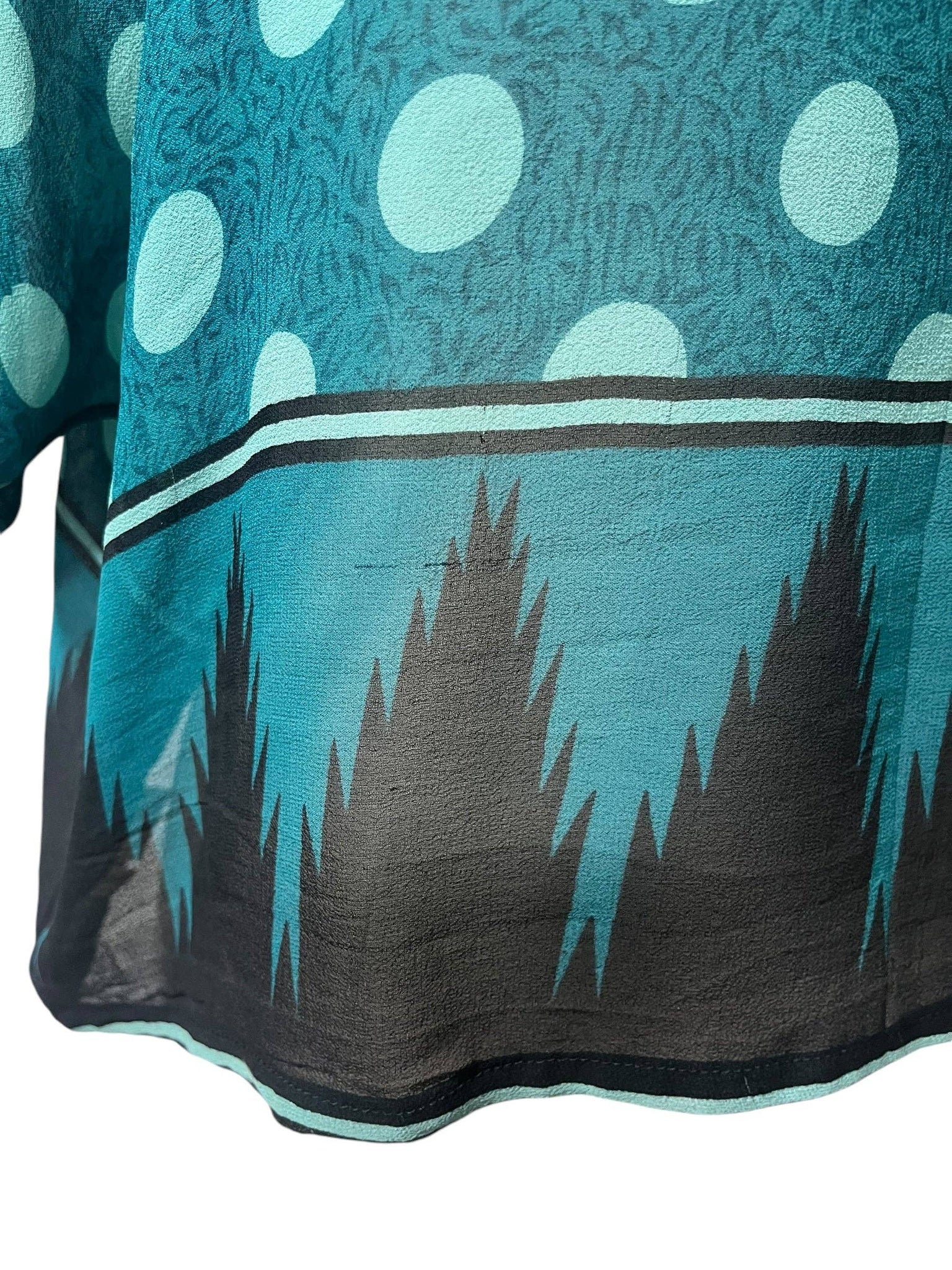 In Eastern philosophy, an Avatar is an incarnation that teaches how to evolve virtues of the past into the present. The Pure Upcycled Silk Avatar Collection is made from vintage pure silk saris, chosen and worn by women in the past to celebrate their lives. If you look very closely, you will see that the silks in this collection show some of the character of their previous incarnations through the appliqués that have been lovingly applied to bring new life to the fabric. This piece is a reminder that we are part of a collective journey to which we all add a little something. These sustainable, pure silk boxy tops are versatile and come in countless colors and prints.